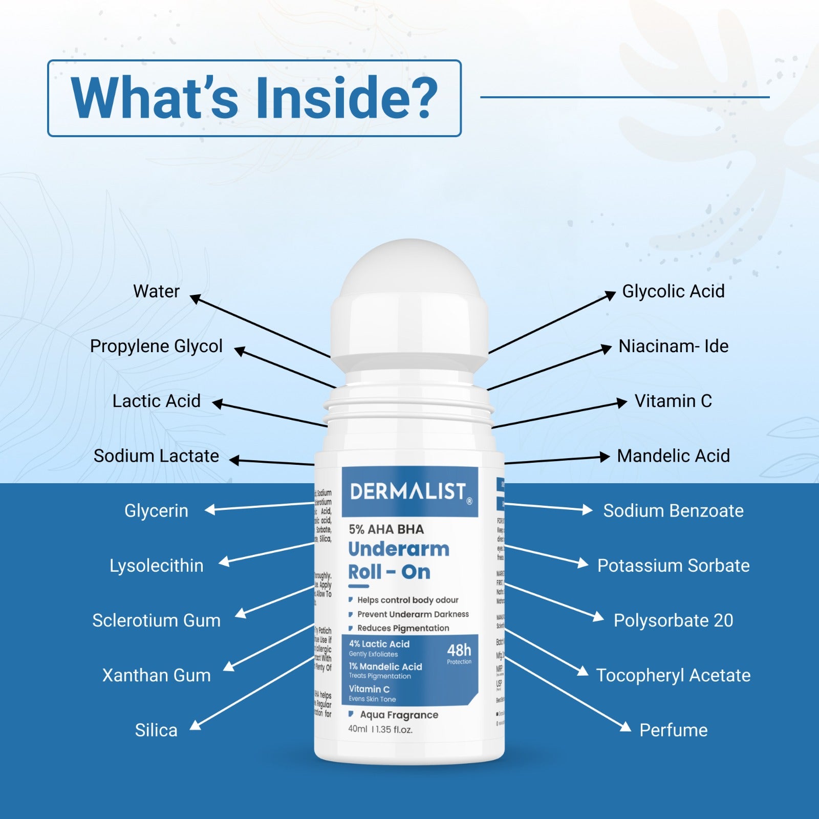 Dermalist 5% AHA BHA Underarm Roll On | Reduces Pigmentation & Odour | Aqua Fragrance Deodorant Roll-on - For Men & Women (40 ml)