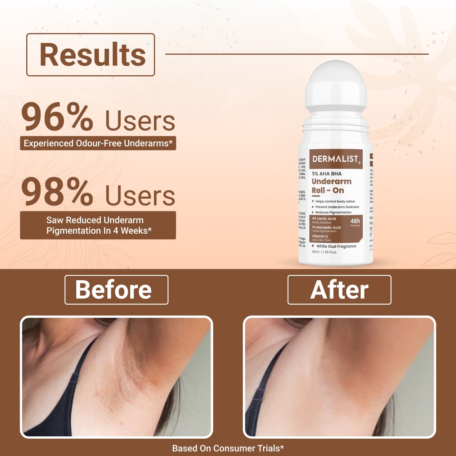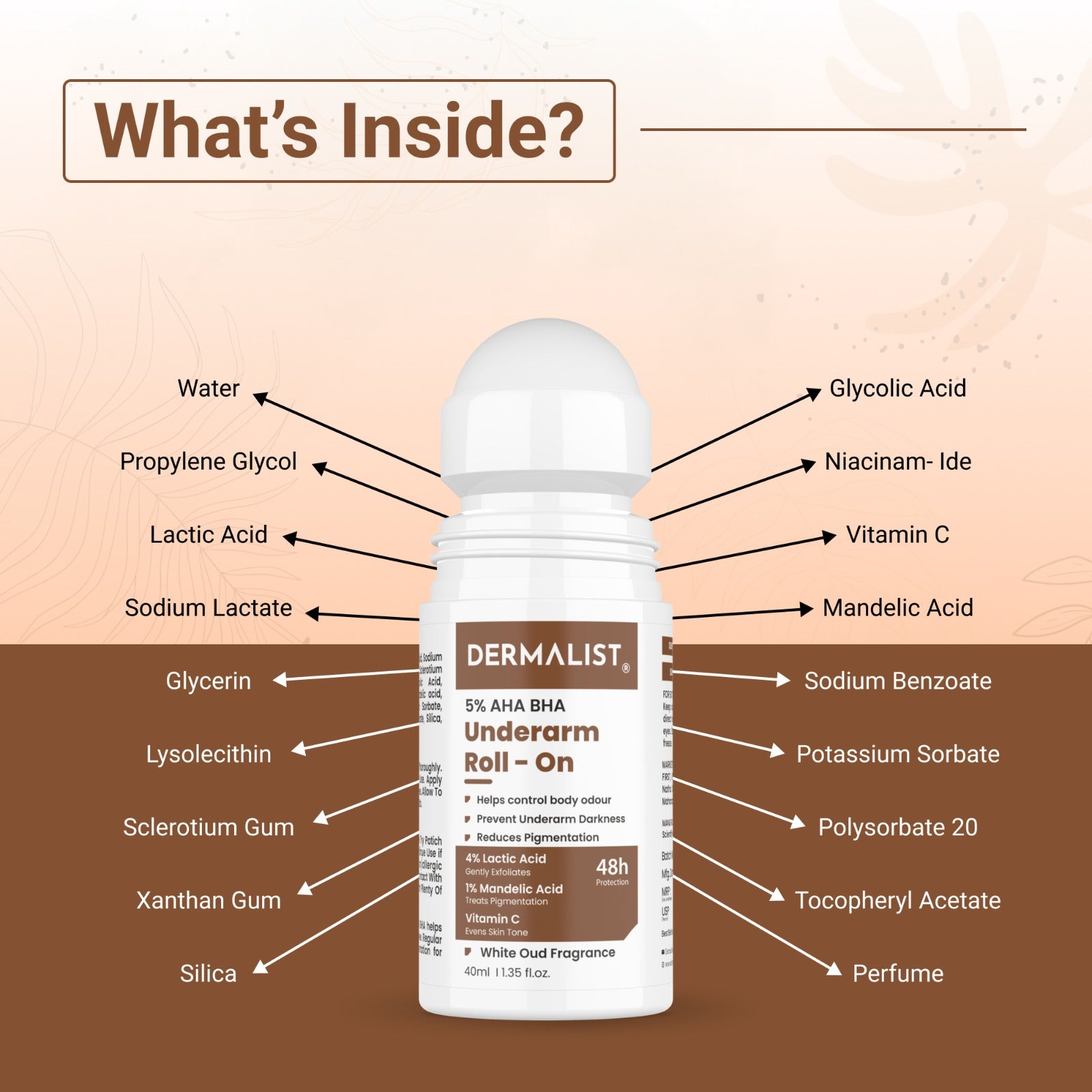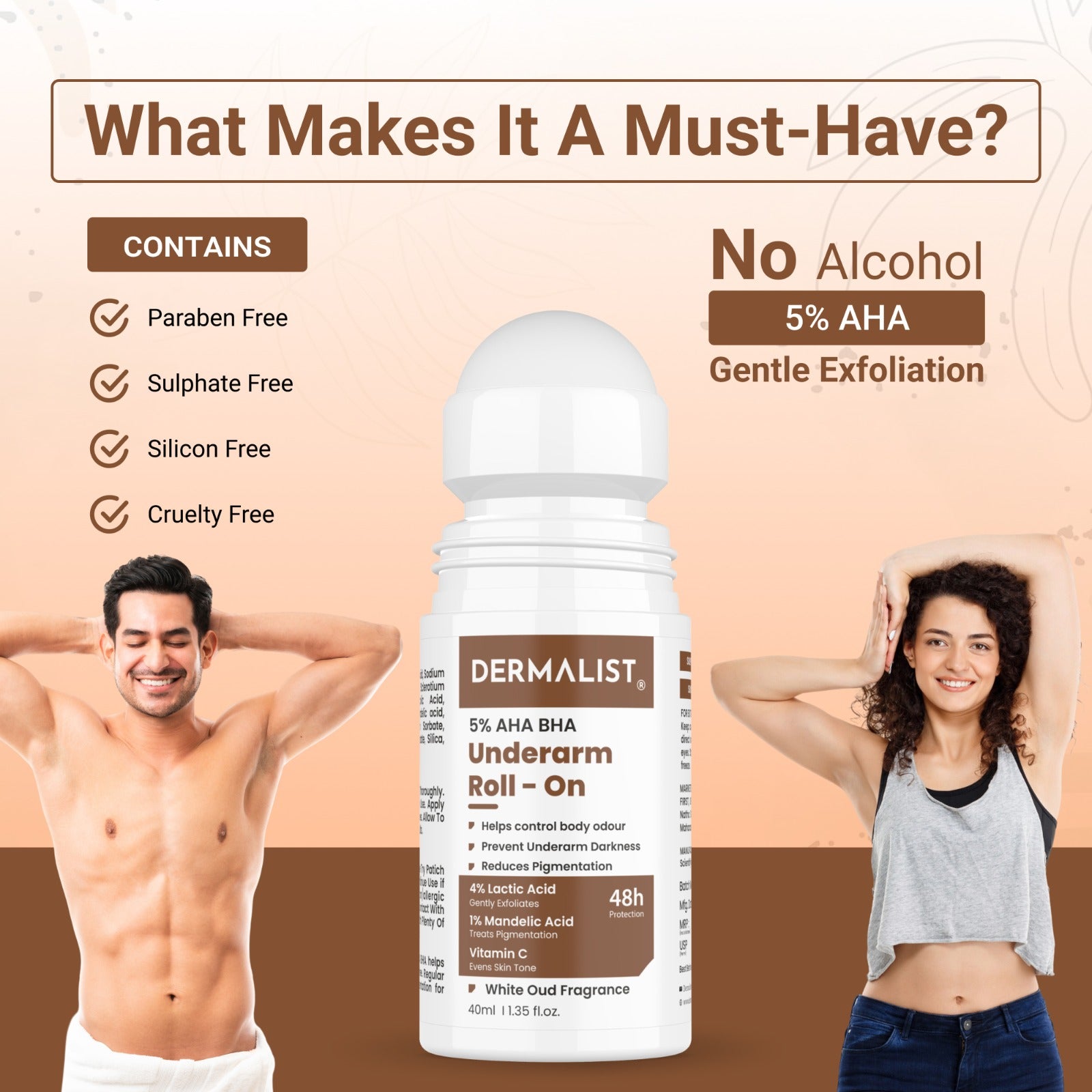 Dermalist 5% AHA BHA Underarm Roll On | Reduces Pigmentation & Odour | White oud Fragrance Deodorant Roll-on - For Men & Women (40 ml)